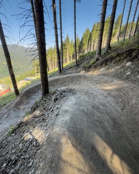 At the Champion Shuttle mountain station, there is a 100-meter long conveyor belt that services the new kids trail, a jump line, and two landing bags, each with two take-offs. Additionally, the Lumberjack Blue Line is being developed here, a nearly 2-kilometer long bike trail that leads directly to the Lumberjack organic mountain restaurant.