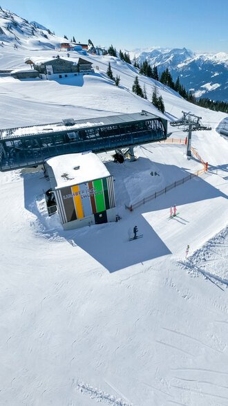 It was also one of the first lifts of its kind in the region. The weather protection covers are adorned with many colorful Crazy Dolls—the crazy mascots of the Shuttleberg, which are especially popular among children. The slopes at this lift are particularly diverse.